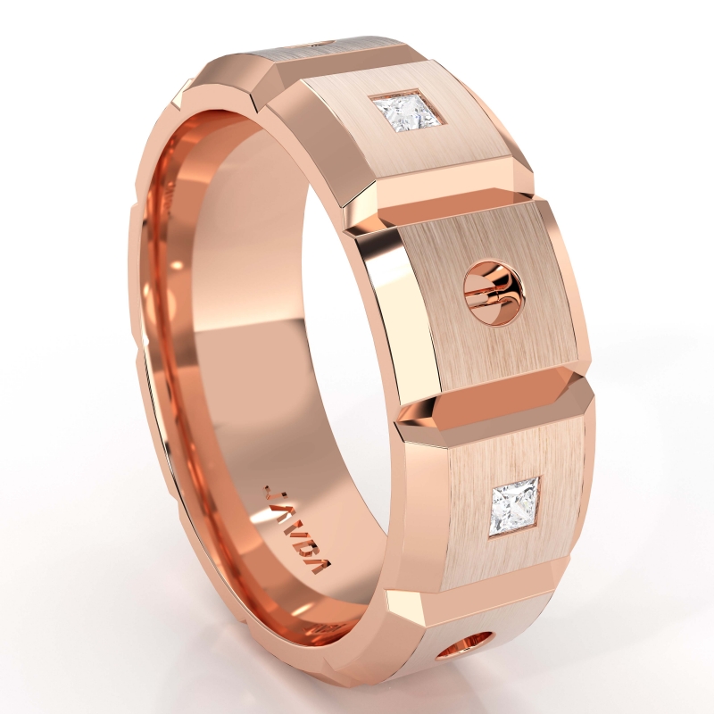 This unique and stunning diamond eternity men's wedding band is made from 10k Rose Gold. Showcasing polished beveled edges and matte finish center with 5 princess cut diamonds set in a bezel setting.