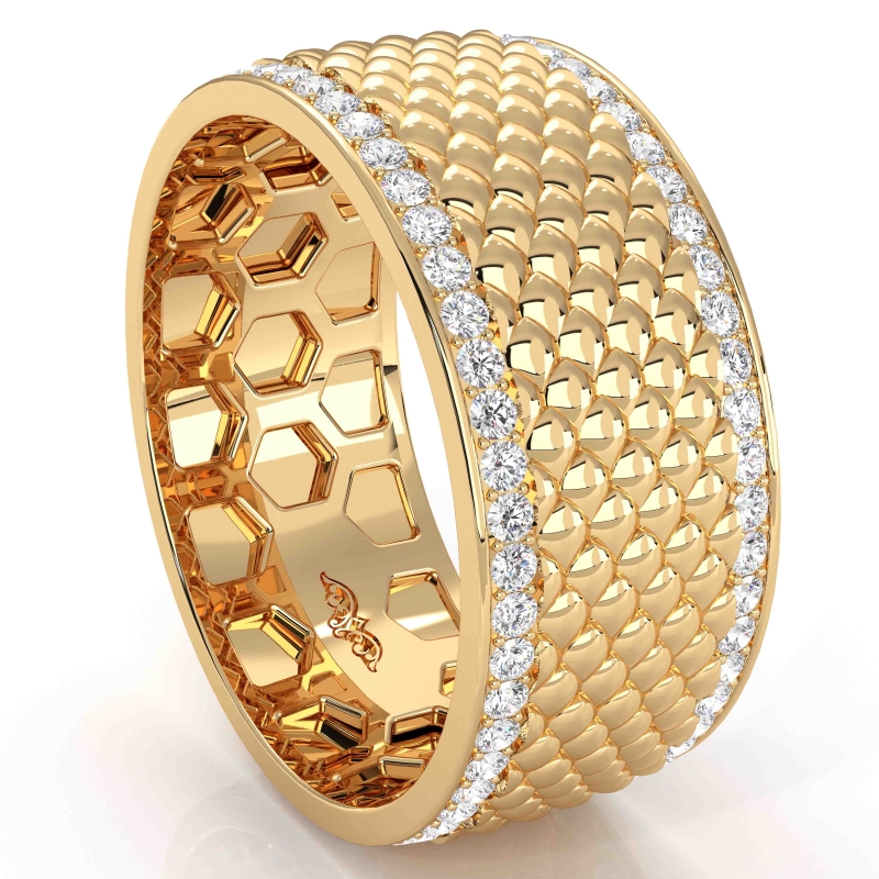 A beautiful fish scale patterned diamond eternity men's wedding band handmade in 10k Yellow Gold. This luxurious wedding ring features round diamonds in a micro pave setting on edges with unique centre pattern in a polished finished metal. Available in 14k & 18k white gold, yellow gold, rose gold and platinum 950. (1Ct. tw.)