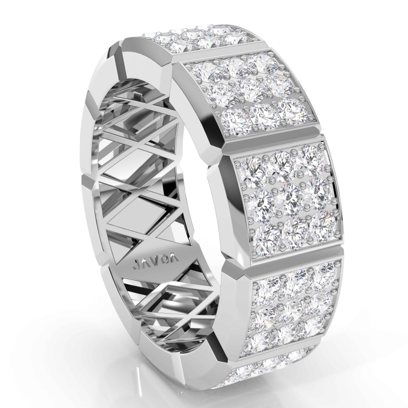 Fashionable 3 row diamond vertical cuts men's eternity wedding band is made from 10k White Gold. Featuring vertical grooved with 3 row round diamonds set in a pave setting.