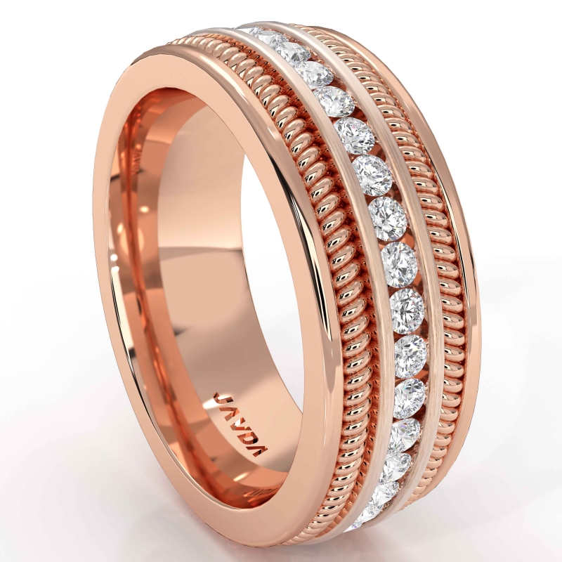 For the everlasting love handmade rope design men's diamond eternity wedding band is crafted in 10k Rose Gold. This ring features yellow gold rope design and beautifully set with white gold round diamonds in a channel setting.