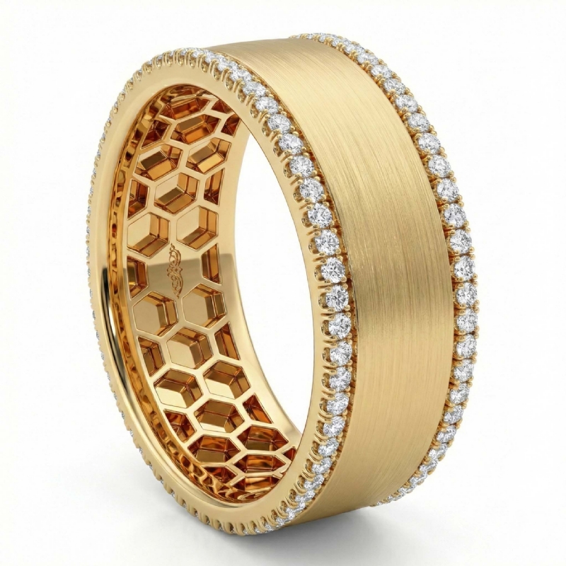 Unique piece of art, this matte finish honeycomb filigree round diamond eternity men's wedding band made in 10k Yellow Gold. This elegant ring features matte finish surface with the honeycomb filigree inside and round diamonds in a split U pave setting on edges. Available in 14k & 18k white gold, yellow gold, rose gold and platinum 950. If you don't find your desired jewelry, please don't hesitate to contact our designer to make your custom jewelry design. (0.75Ct. tw.)