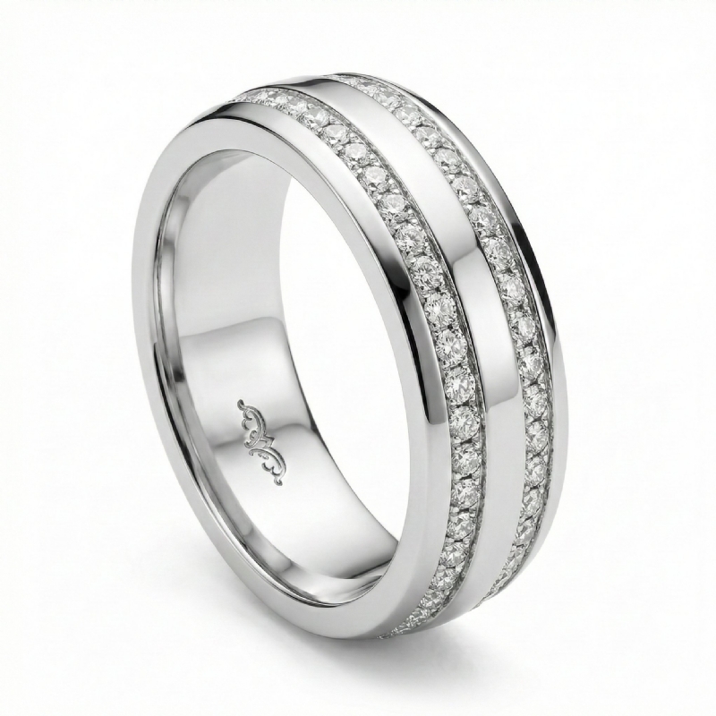 Classic and stylish dome 2 row round diamond eternity men's wedding band is made from 10k White Gold. Showcasing this ring polished finished dome with two row total round diamonds in a channel setting.