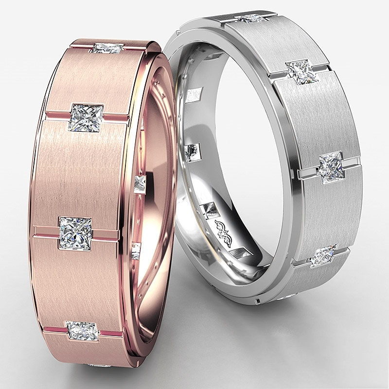 The handmade design grooved men's princess diamond eternity wedding band is crafted in solid 10k Rose Gold. Showcasing polished finished step edge with princess bezel set diamonds beautifully set on vertical grooves.