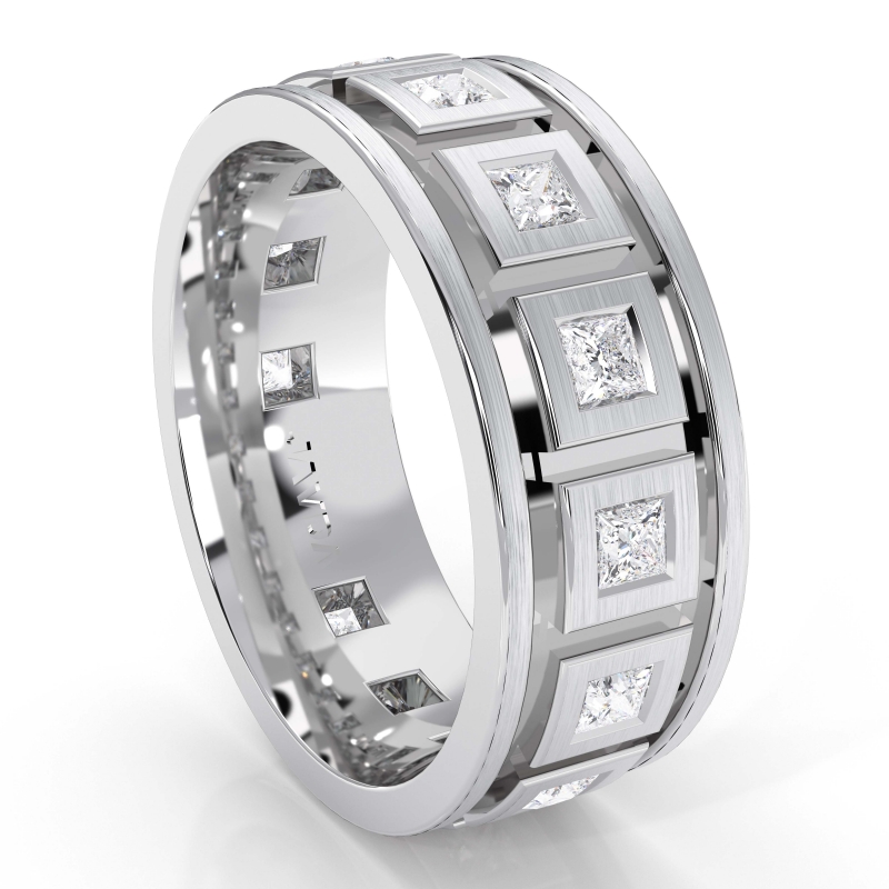 This men's matte finish diamond eternity wedding band has been crafted in 10k White Gold. Featuring matte finished flat edge and bezel princess diamond beautifully set in a box style.