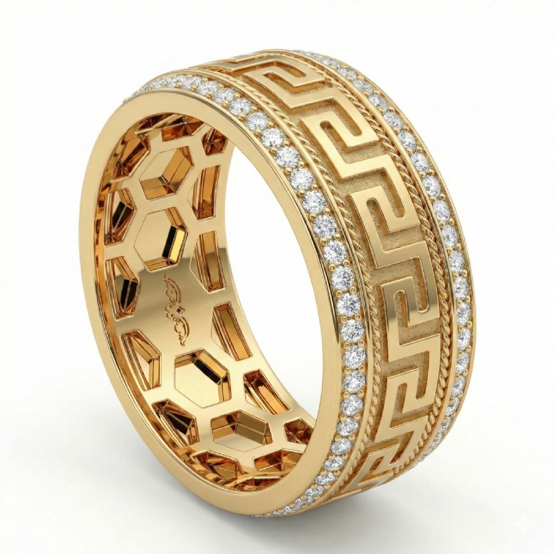 Striking greek key design round diamond eternity men's wedding band made in 10k Yellow Gold. This elegant and stylish ring features greek key design along the center in a matte finish yellow gold and polished rope in white gold on edges, with round diamonds in a micro pave setting. Also available in 14k & 18k white gold, yellow gold, rose gold, two-tone gold and platinum 950. If you don't find your desired jewelry, please don't hesitate to contact our designer to make your custom jewelry design. (0.9Ct. tw.)