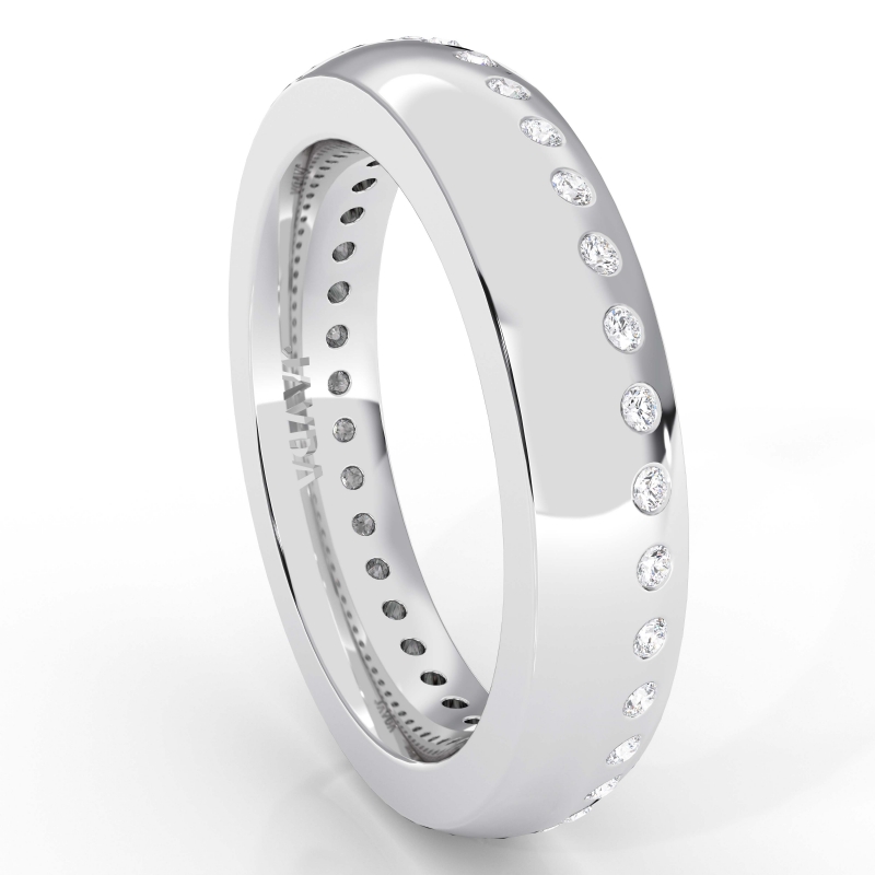 Classic dome bezel set men's diamond eternity wedding band is made from solid 10k White Gold. This handsome wedding band features polished finish dome band with round diamond in a bezel setting.