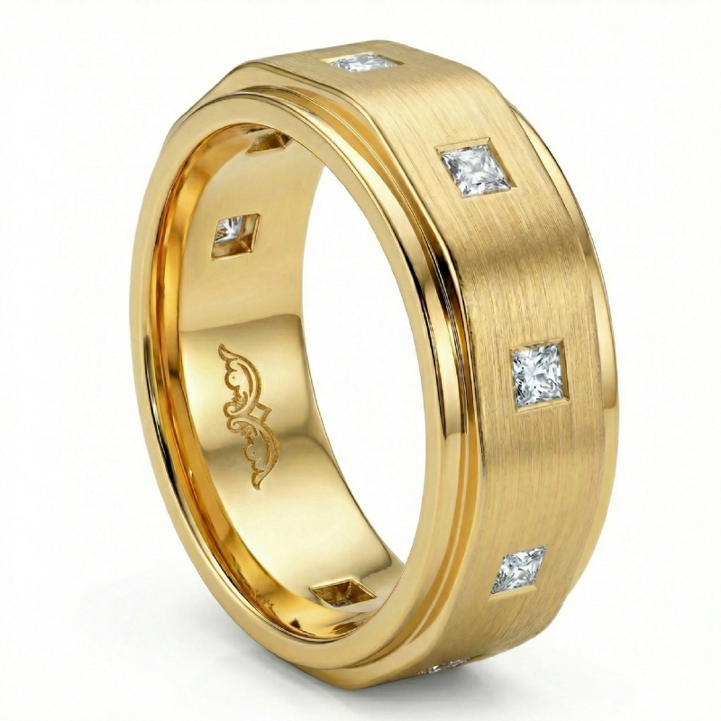 Stylish handmade matte finish men's diamond eternity wedding band made in 10k Yellow Gold. Showcasing bezel set princess diamonds on matte finish surface with polished finish edges. We can make this wedding ring in all available metals like 14k & 18k white gold, yellow gold, rose gold, and platinum 950. (0.8Ct. tw.)