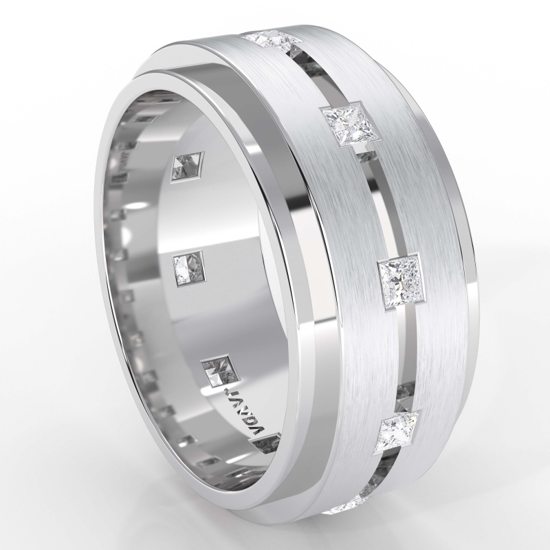 This timeless classic style polished finish princess diamond eternity men's wedding band is made from 10k White Gold. Featuring polished finished step edge and center horizontal grooved with princess diamonds in a bezel setting.