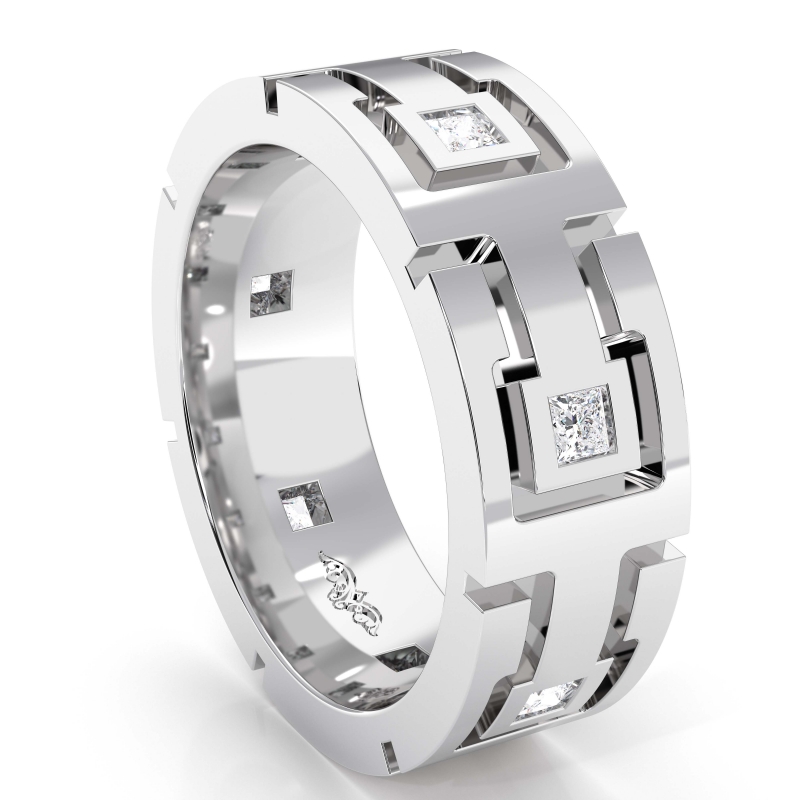This unique style princess diamond eternity men's wedding band handcrafted in gold and platinum. Features 0.50 carat princess diamonds in a bezel setting on link design. Available in 14k & 18k white gold, yellow gold, rose gold and platinum 950. (0.5Ct. tw.)
