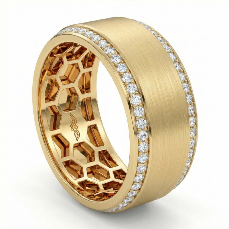 This comfort fit matte finish round diamond eternity men's wedding band handcrafted in 10k Yellow Gold. Features honeycomb filigree inside the ring and center area matte finished with round diamonds in a micropave setting on both sides of the band. Also available in 14k & 18k white gold, yellow gold, rose gold and platinum 950. If you don't find your desired jewelry, please don't hesitate to contact our designer to make your custom jewelry design. (0.75Ct. tw.)