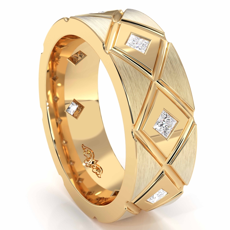 Designer diamond cut men's eternity princess diamond wedding band crafted in 10k Yellow Gold. This master piece features princess diamonds in a bezel setting on matte finish and beautiful diamond cut grooved in a polished finish. This band for men is available in 14k and 18k white gold, yellow gold, rose gold and platinum 950. (0.6Ct. tw.)