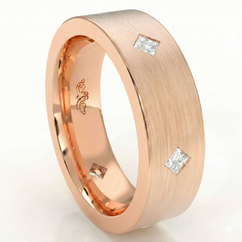Simple and unique bezel diamond men's eternity wedding band made in 10k Rose Gold. This wedding ring for men features princess diamonds set on matte finish surface in a bezel setting with kite style. This classic wedding ring is available in 14k & 18k white gold, yellow gold, rose gold, and platinum 950. (0.55Ct. tw.)