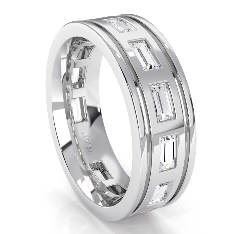 The classy look bezel set baguette men's diamond eternity wedding band is made from quality 10k White Gold. Featuring polished finish parallel grooved with baguette in a bezel setting.