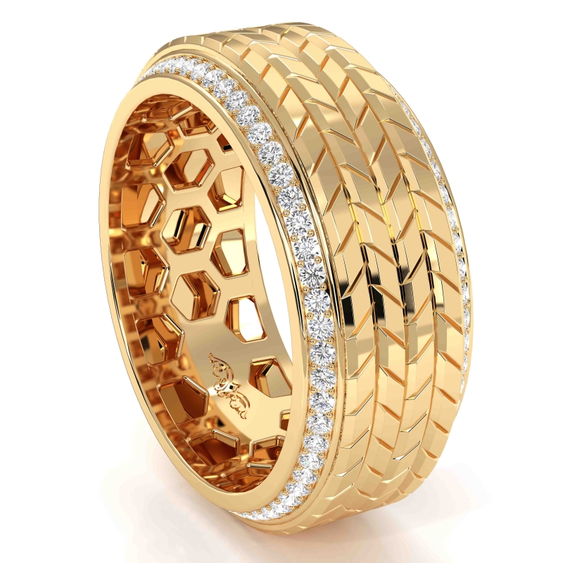 Remarkable grooved tyre tread men's diamond eternity wedding band made in 10k Yellow Gold. Features 0.60 carat round diamonds with center grooved in a tyre tread style, side diamonds in a micro pave setting on edges adding a modern flair. This handsome wedding band available in 14k & 18k white gold, yellow gold, rose gold and platinum 950. (0.6Ct. tw.)