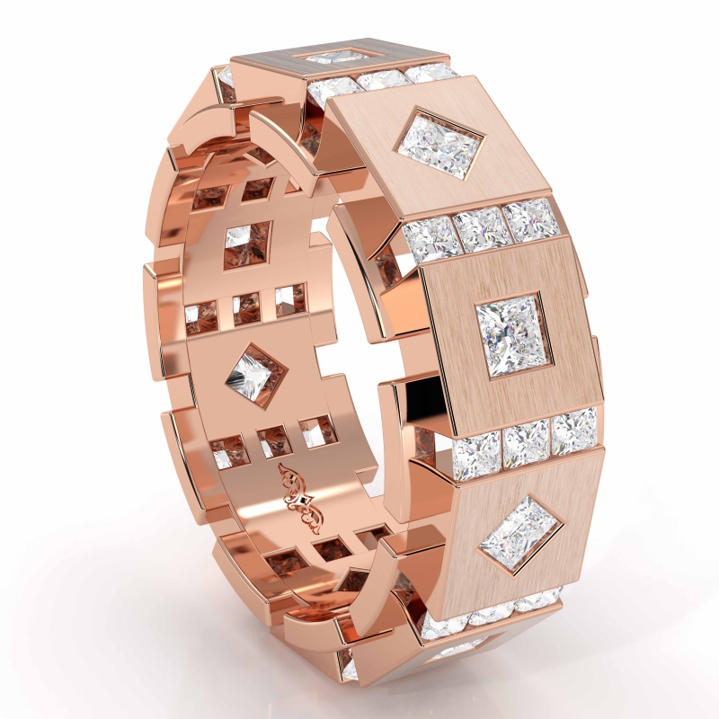This hot diamond eternity men's wedding band crafted in 10k Rose Gold. Featuring princess diamonds in a channel & bezel setting, designed in a box & kite style. Available in 14k & 18k white gold, yellow gold and rose gold & platinum 950. (3Ct. tw.)