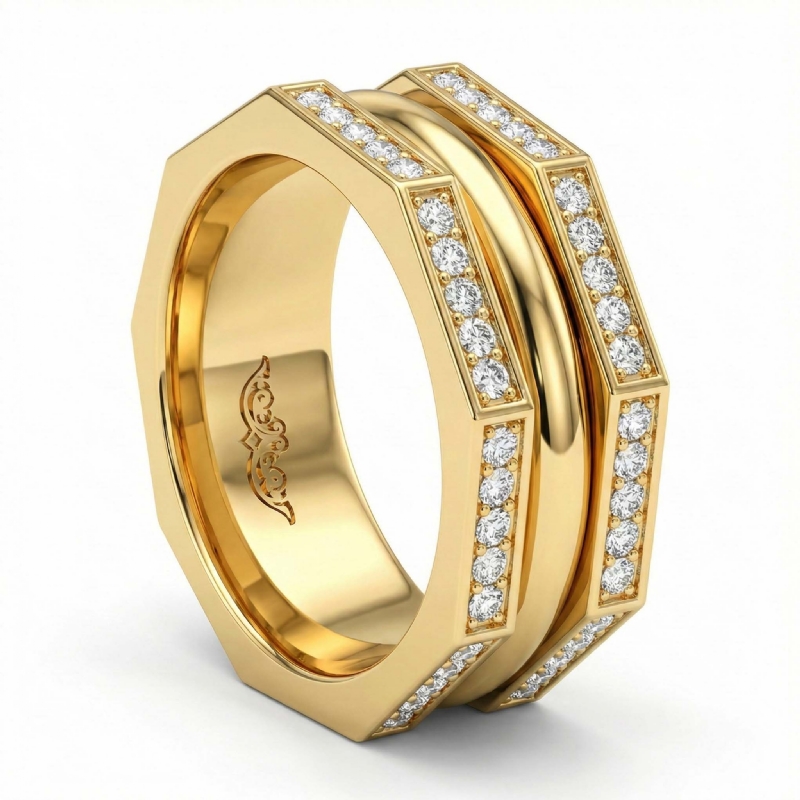 This handmade unique hexagonal style round diamond eternity men's wedding band made in 10k Yellow Gold. Features hexagonal sides with round diamonds in a micro pave setting and polished finish center dome. This comfort-fit anniversary ring also available in 14k & 18k white gold, yellow gold, rose gold, and platinum 950. If you don't find your desired jewelry, please don't hesitate to contact our designer to make your custom jewelry design. (0.8Ct. tw.)