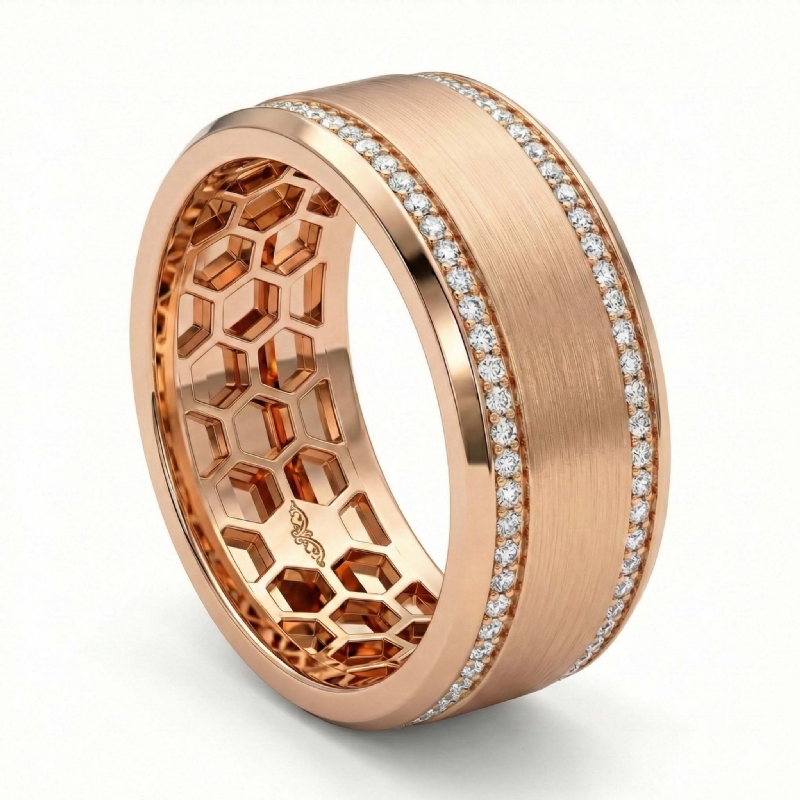 This classic and stylish matte finish beveled edges round diamond eternity men's wedding band crafted in 10k Rose Gold. Features matte finish center and polished beveled edges with round diamonds in a micropave setting on edges. Also available in 14k & 18k white gold, yellow gold, rose gold and platinum 950. If you don't find your desired jewelry, please don't hesitate to contact our designer to make your custom jewelry design. (0.75Ct. tw.)