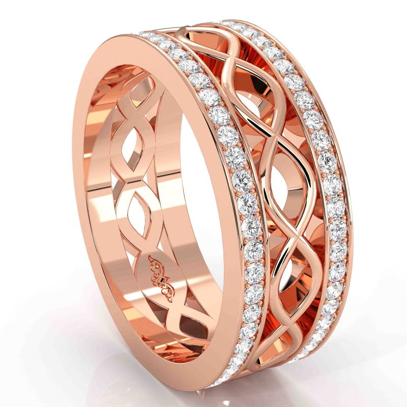 A symbol of everlasting love, infinity center diamond eternity men's wedding band handmade in 10k Rose Gold. Features round diamonds in a micro pave setting on edges with beautiful infinity twist design in a polished finished metal. This wedding band is also available in 14k & 18k white gold, yellow gold, rose gold and platinum 950. If you don't find your desired jewelry, please don?t hesitate to contact our designer to make your custom jewelry design (1Ct. tw.)