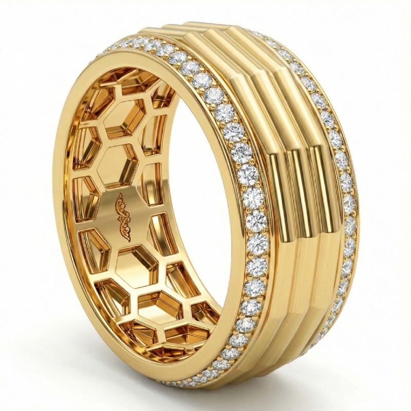 Unique style octagon grooved round diamond eternity men's wedding band handcrafted in 10k Yellow Gold. Luxury with style, this classic ring features polished finish octagon grooved center with round diamonds in a micro pave setting on the edges with honeycomb design inside the ring. Also available in 14k & 18k white gold, yellow gold, rose gold, two-tone gold and platinum 950. If you don't find your desired jewelry, please don't hesitate to contact our designer to make your custom jewelry design. (0.9Ct. tw.)