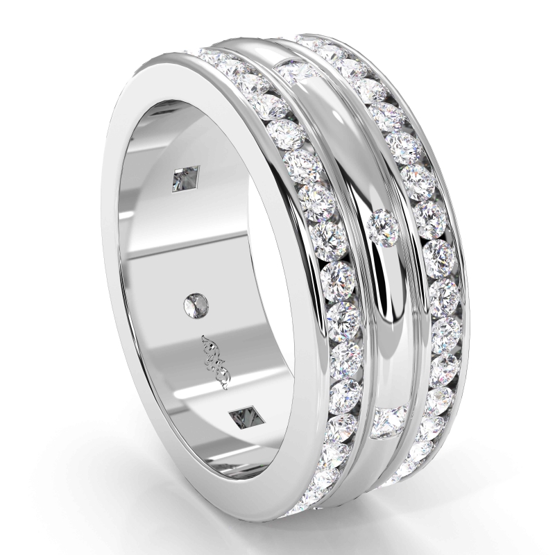 A magnificent princess & round diamond men's eternity wedding band is crafted in 10k White Gold. This polished finish wedding ring features princess diamonds in a bezel setting and