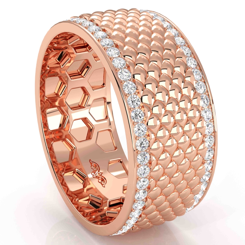 A beautiful fish scale patterned diamond eternity men's wedding band handmade in 10k Rose Gold. This luxurious wedding ring features round diamonds in a micro pave setting on edges with unique centre pattern in a polished finished metal. Available in 14k & 18k white gold, yellow gold, rose gold and platinum 950. (1Ct. tw.)