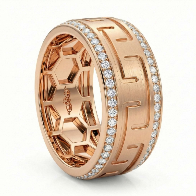 This beautifully designed matte finish greek key pattern round diamond eternity men's wedding band made in . Features matte finish greek key pattern along the center and 10k Rose Gold round diamonds in a micro pave setting on the edges with honeycomb design inside the ring. Also available in 14k & 18k white gold, yellow gold, rose gold and platinum 950. If you don't find your desired jewelry, please don't hesitate to contact our designer to make your custom jewelry design. (0.9Ct. tw.)