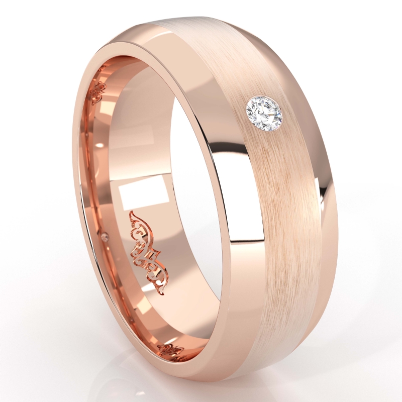 This solid bezel set round diamond beveled edge men's wedding band crafted in 10k Rose Gold. Features polished beveled edges and center matte finish with single round diamond in bezel setting. Available in 14k & 18k white gold, yellow gold, rose gold and platinum 950. If you don't find your desired jewelry, please don't hesitate to contact our designer to make your custom jewelry design (0.05Ct. tw.)