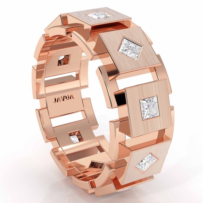 Luxurious and romantic, this men's princess diamond matte eternity wedding band is made from precious 10k Rose Gold. A truly hot design features box style block link in a matte finish with princess cut diamond set in a bezel setting.