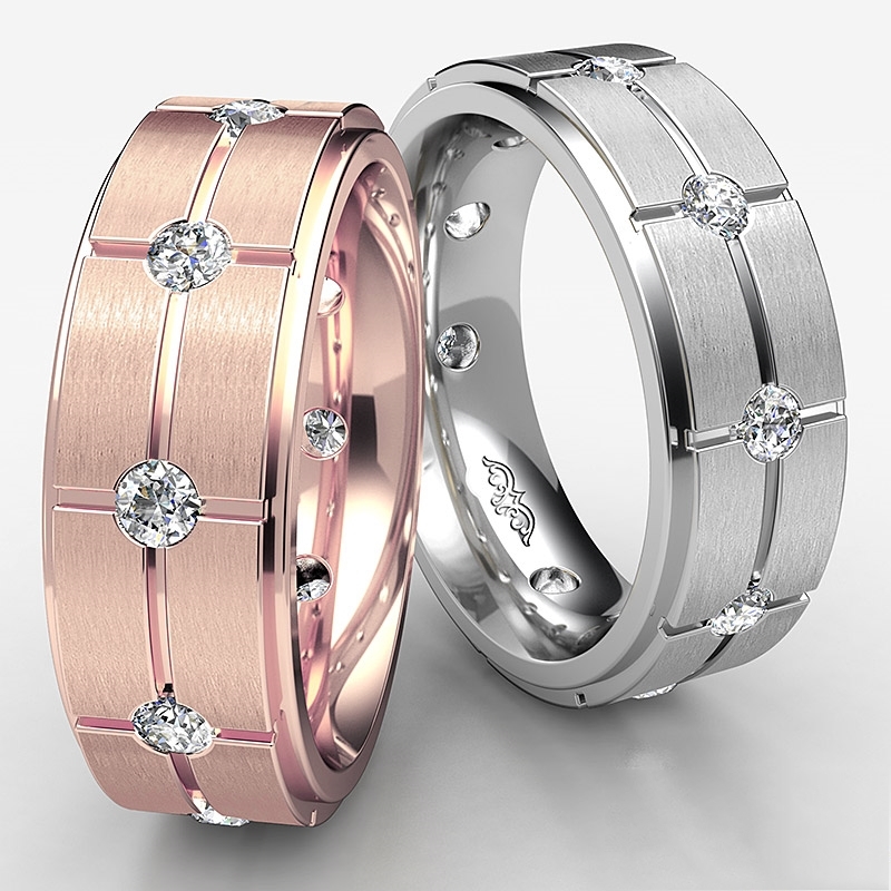 This stylish 9mm wide ring for him is comfort fit and available in 14k & 18k white gold, yellow gold and rose gold & platinum 950.