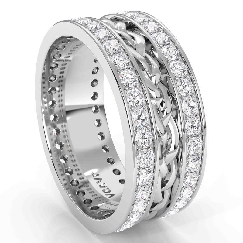 A handmade braided design men's diamond eternity wedding band is made from 10k White Gold. Featuring yellow gold braided design in the center and pave set round diamonds beautifully set with white gold.