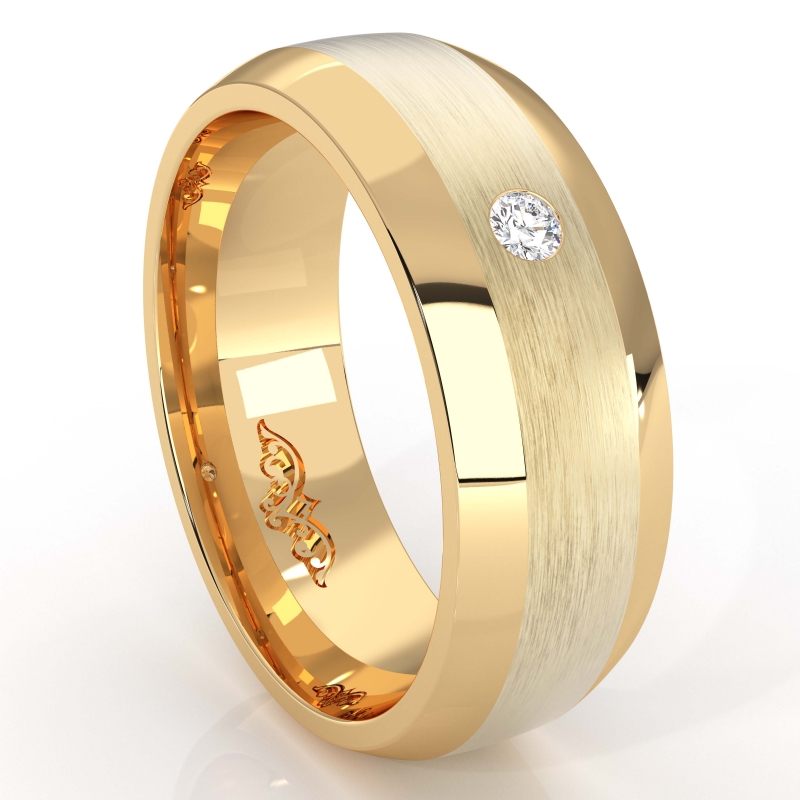 This solid bezel set round diamond beveled edge men's wedding band crafted in 10k Yellow Gold. Features polished beveled edges and center matte finish with single round diamond in bezel setting. Available in 14k & 18k white gold, yellow gold, rose gold and platinum 950. If you don't find your desired jewelry, please don't hesitate to contact our designer to make your custom jewelry design (0.05Ct. tw.)