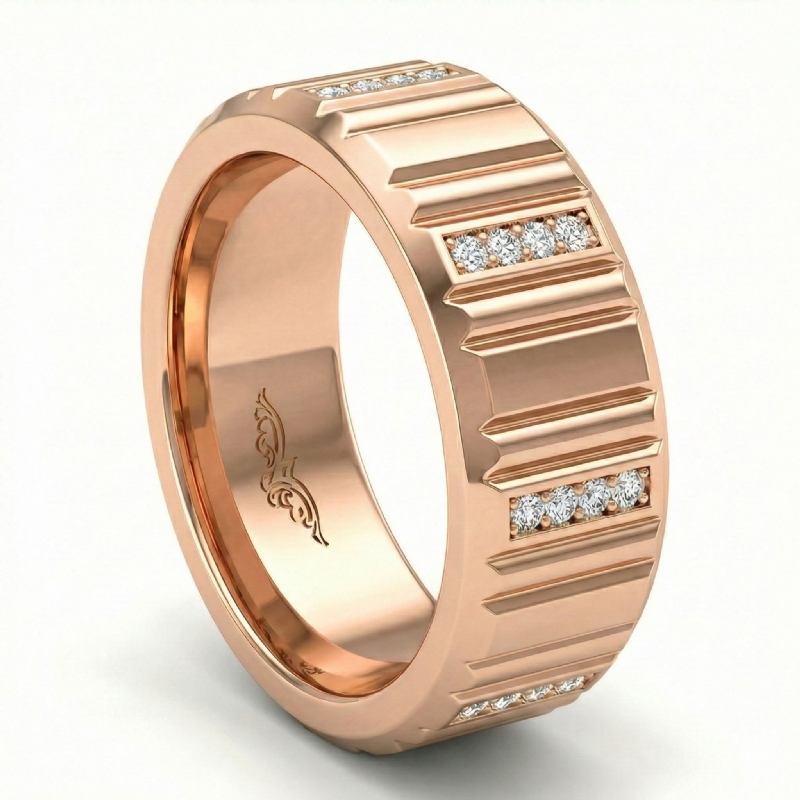 This comfort-fit wide vertical cuts round diamond eternity men's wedding band handcrafted in high quality 10k Rose Gold. Features polished finish vertical cuts and the row of round diamonds in a micro pave setting compliment the ring. Also available in 14k & 18k white gold, yellow gold, rose gold, and platinum 950. If you don't find your desired jewelry, please don't hesitate to contact our designer to make your custom jewelry design. (0.25Ct. tw.)