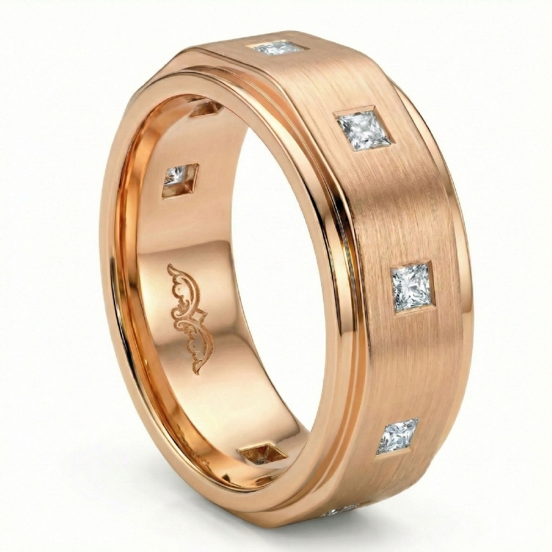Stylish handmade matte finish men's diamond eternity wedding band made in 10k Rose Gold. Showcasing bezel set princess diamonds on matte finish surface with polished finish edges. We can make this wedding ring in all available metals like 14k & 18k white gold, yellow gold, rose gold, and platinum 950. (0.8Ct. tw.)