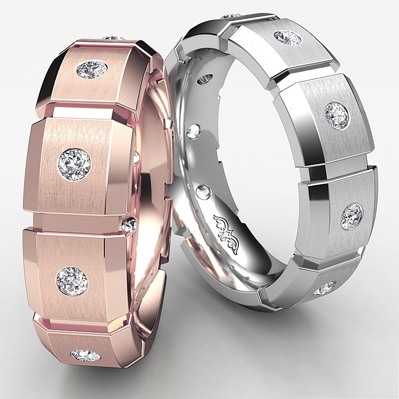 A stunning block link round diamond men's eternity wedding band is made from solid 10k Rose Gold. Featuring polished finished beveled edge and block link with round diamonds in a bezel setting.