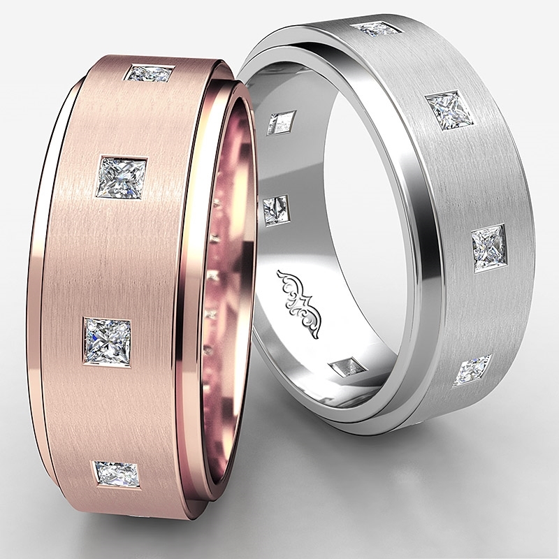 Fashionable & affordable polished finish princess diamond eternity men's wedding band is made from solid 10k Rose Gold. Showcasing polished finished step edge with princess diamonds in a bezel setting.