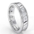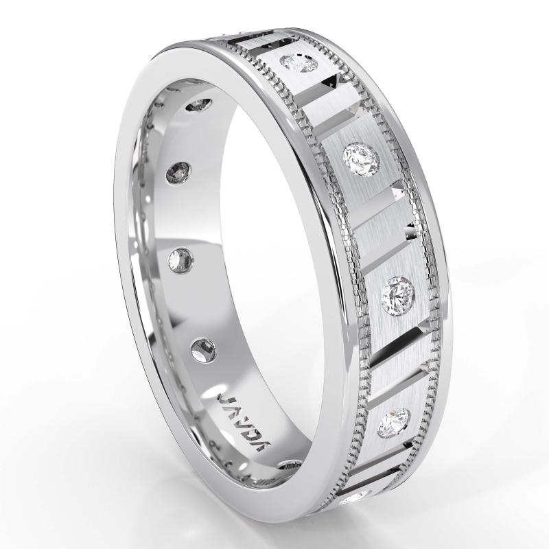 This handsome comfort fit men's diamond carved eternity wedding band made from 10k White Gold. Featuring parallel vertical groove and milgrain edges with round diamond in a bezel setting.