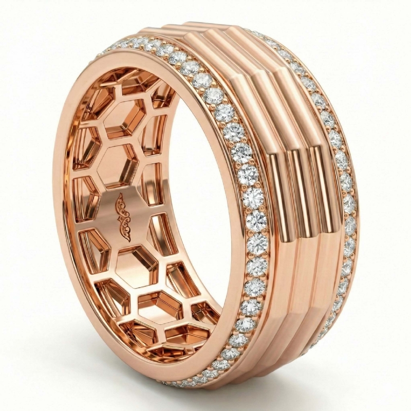 Unique style octagon grooved round diamond eternity men's wedding band handcrafted in 10k Rose Gold. Luxury with style, this classic ring features polished finish octagon grooved center with round diamonds in a micro pave setting on the edges with honeycomb design inside the ring. Also available in 14k & 18k white gold, yellow gold, rose gold, two-tone gold and platinum 950. If you don't find your desired jewelry, please don't hesitate to contact our designer to make your custom jewelry design. (0.9Ct. tw.)