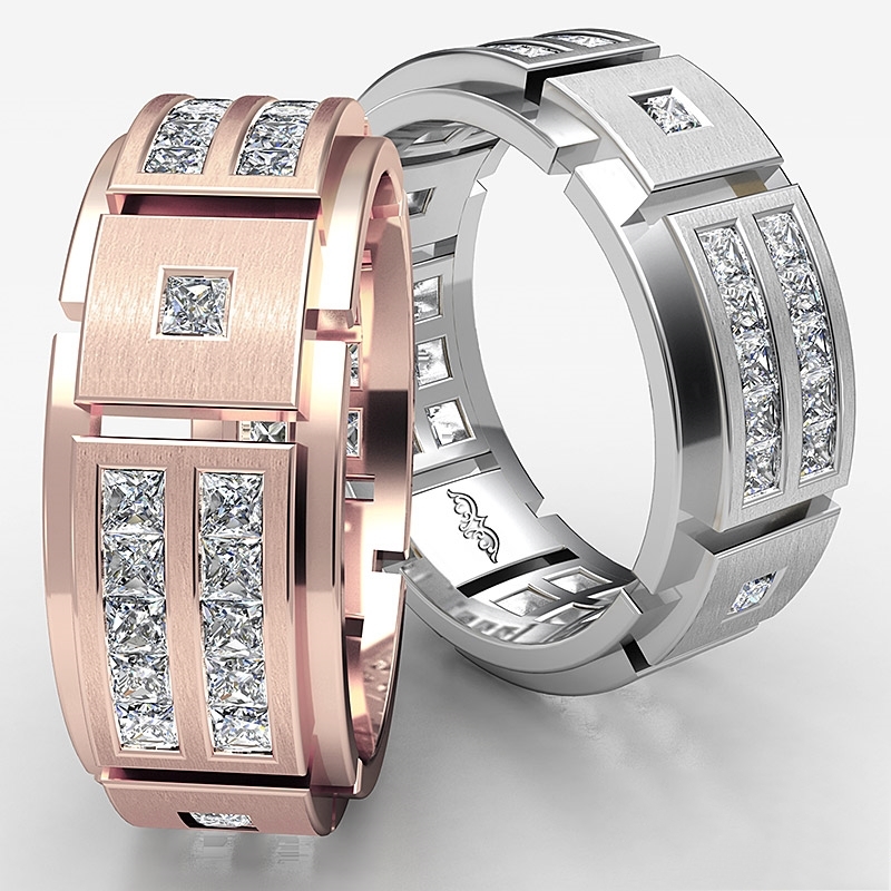 A stunning 2 row men's princess diamond eternity wedding band is crafted in quality 10k Rose Gold. Featuring this ring polished finished with vertical grooved and princess diamonds in a channel setting.