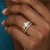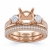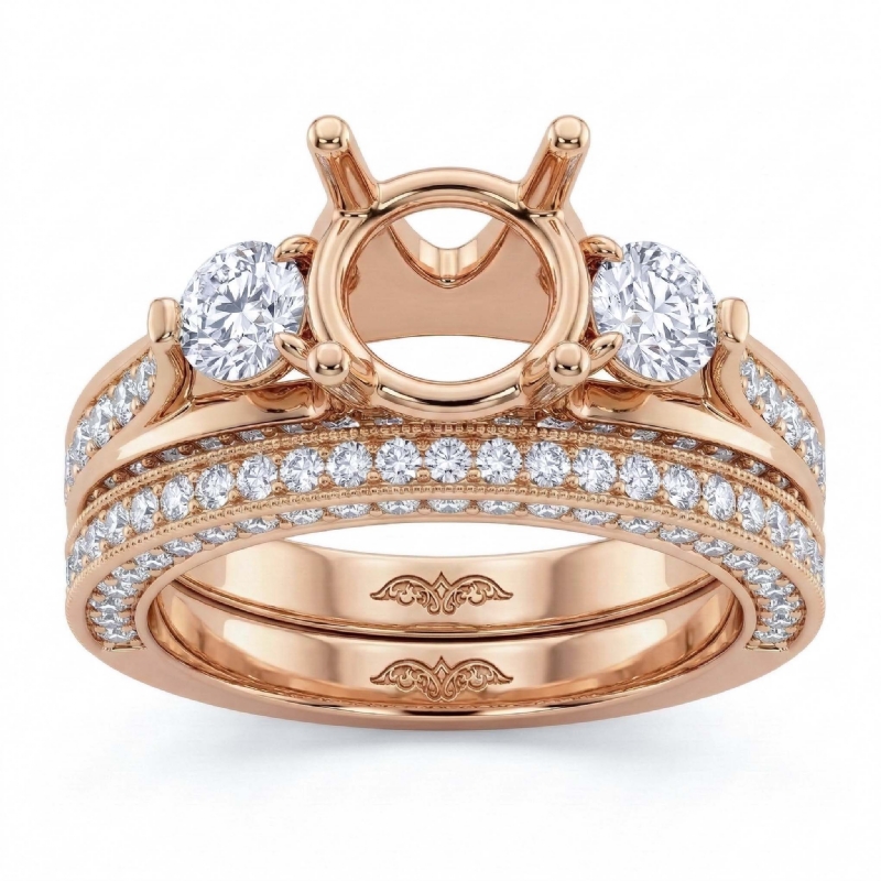 Glamorous and elegant, this three-stone semi mount ring triples the shimmer with two round cut side stones and pave set diamonds decorating the shank. Made in 18k Rose Gold, this bridal set comes with a matching band. (3Ct. tw.)