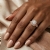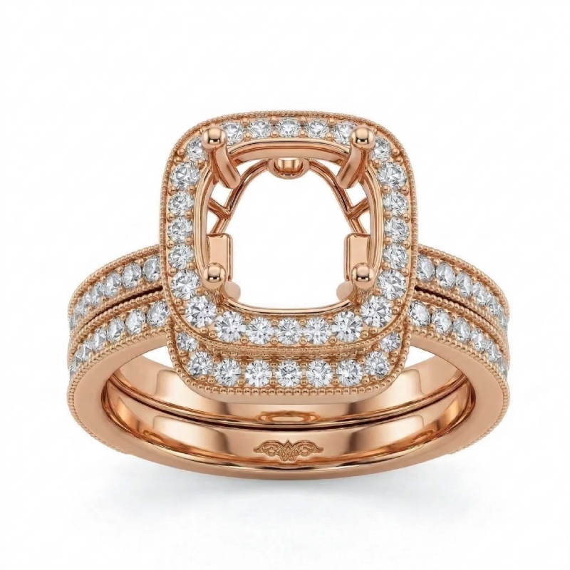 Intricately designed, this milgrain round cut semi mount engagement ring and wedding band features . round halo pave set diamonds along the shank. Made in 18k Rose Gold, this bridal set is truly beautiful. (1Ct. tw.)