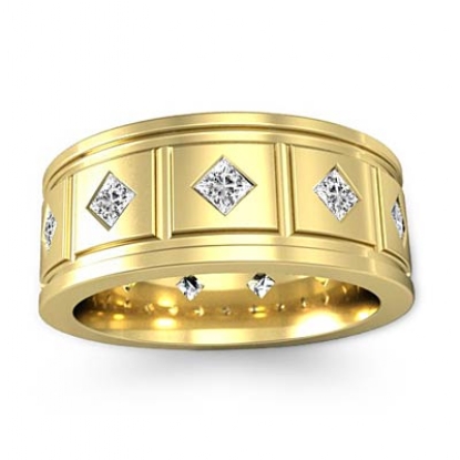 A traditional kite set princess diamond men's eternity wedding band is made from 18k Gold Yellow. This comfort fit ring features box design with vertical and horizontal parallel grooved and princess cut diamond set in a bezel setting.