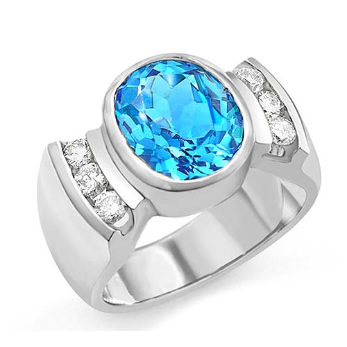 Oval Blue Topaz Gemstone Diamond Ring 18k W Gold (0.55Ct. tw.)