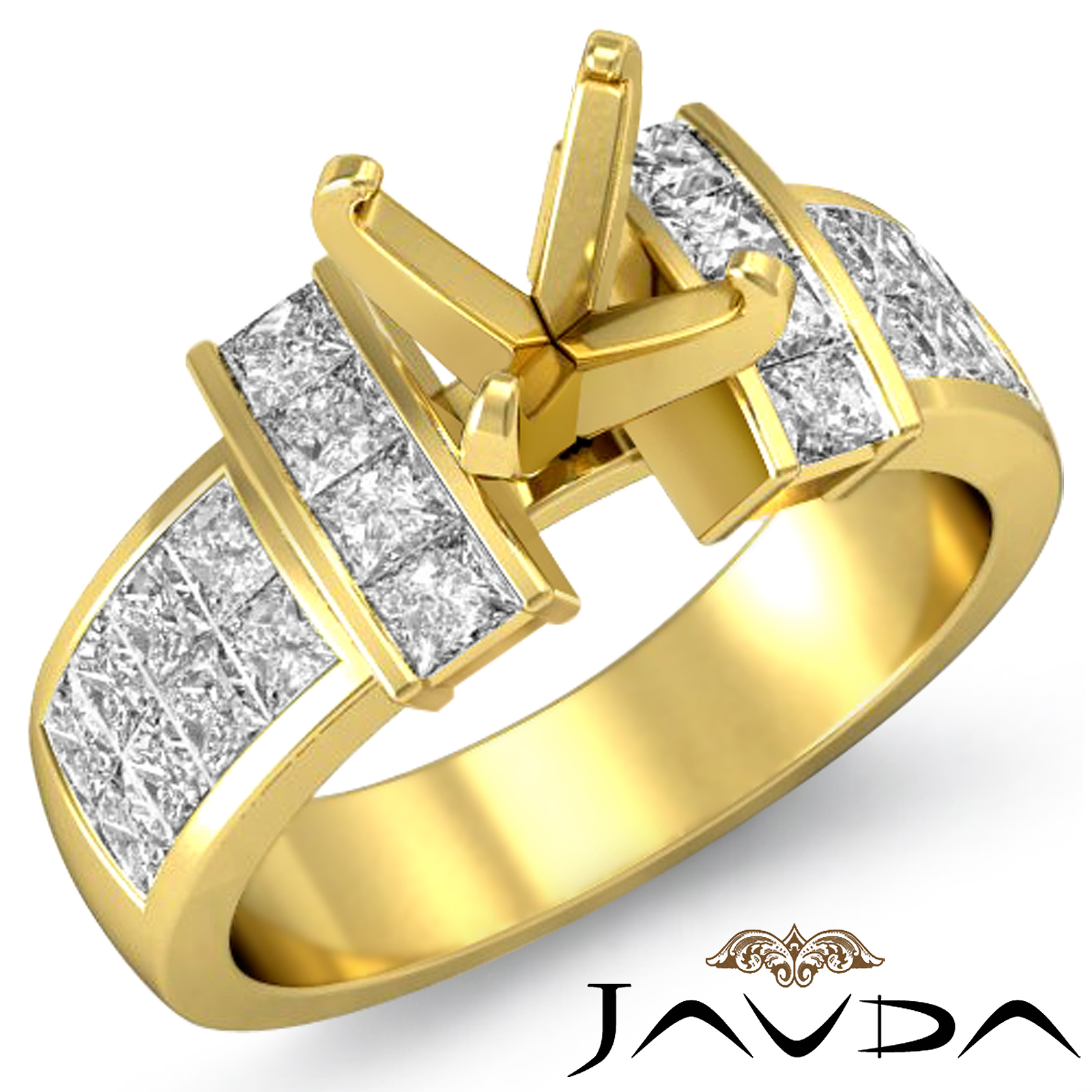 Forever timeless, this luxurious polished finish ring is made in 18k Gold Yellow. It features a round semi mount, with princess cut diamonds in invisible setting dazzling along the shank. (1.03Ct. tw.)