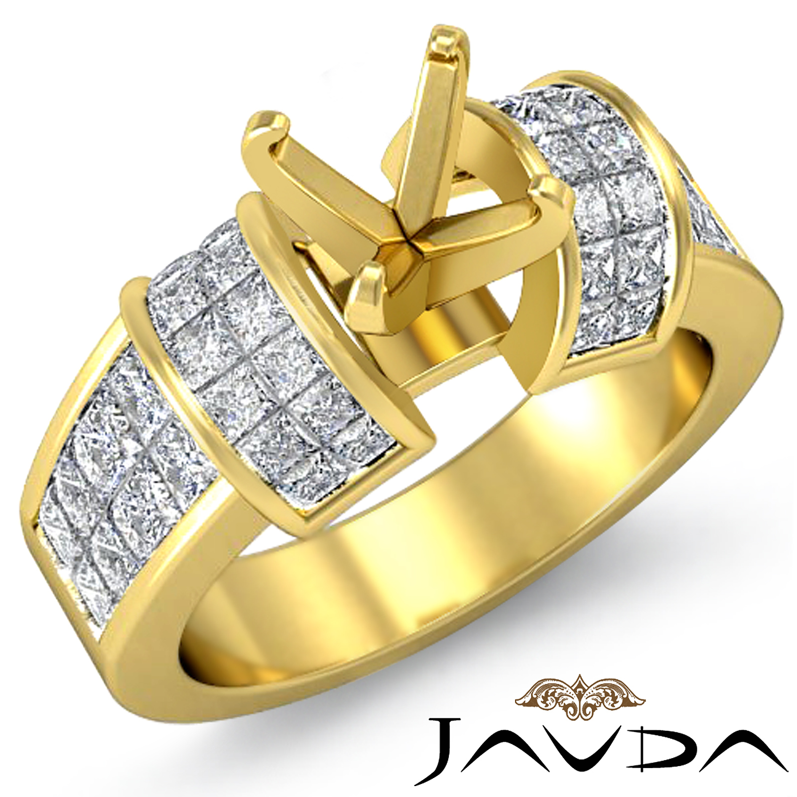 Alluring in every way, this classic polished finish ring is made in 18k Gold Yellow. It features a round semi mount, with princess cut diamonds in invisible setting shimmering along the shank. (1.96Ct. tw.)