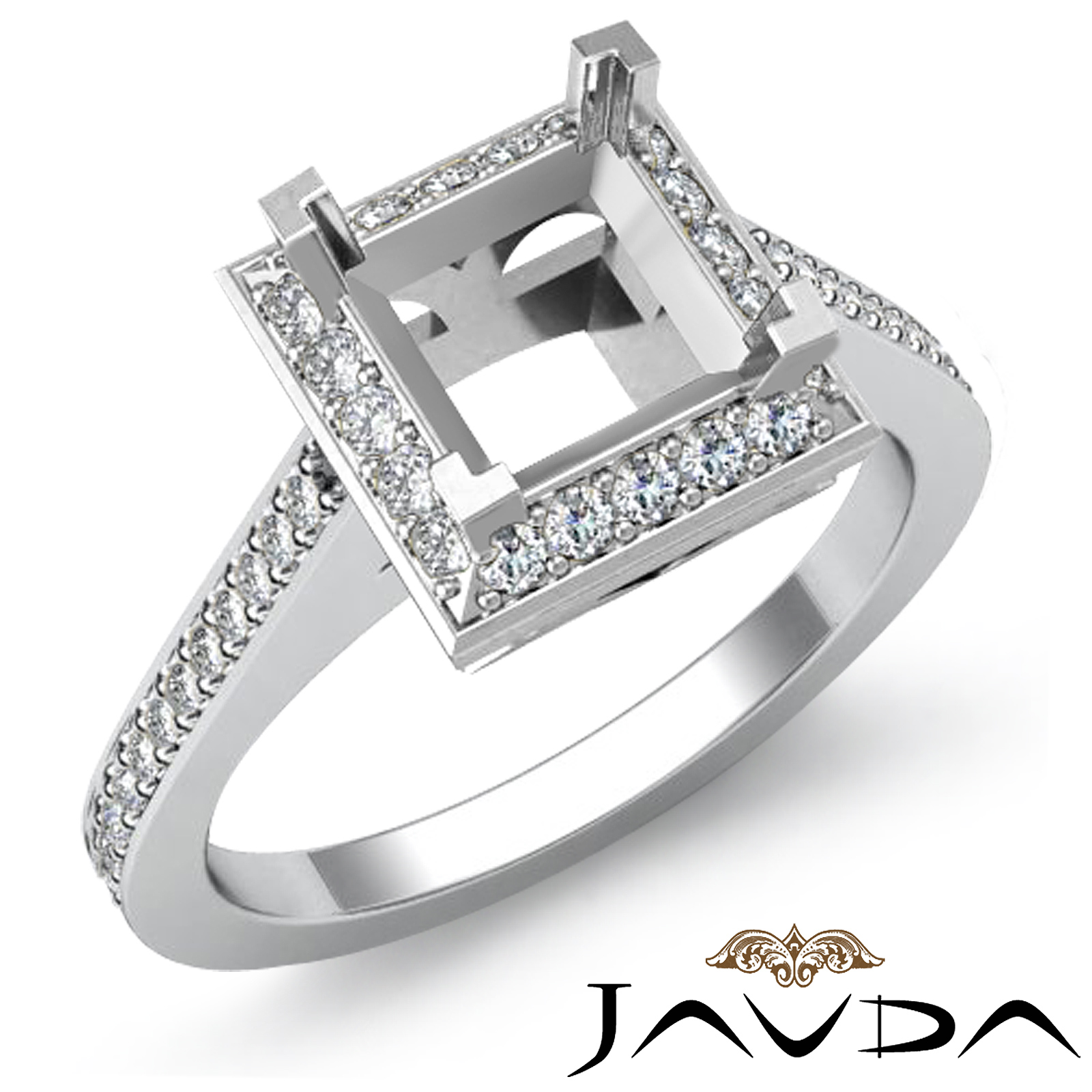 Lavishly romantic, this diamond engagement ring is made in glorious Platinum 950. This princess semi mount ring features pave set round diamonds in halo & along the shank. (0.5Ct. tw.)