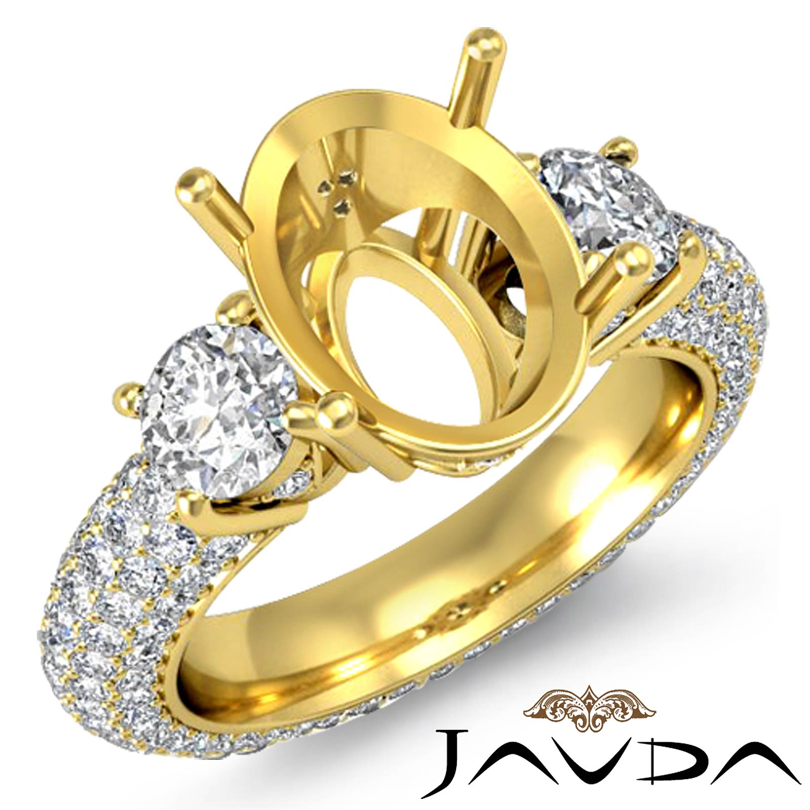 Unique! This ring features a semi mount oval center diamond, clustered by two round cut side diamonds all in prong setting. Pave set diamonds along the shank make for a spectacular show in this 14k Gold Yellow engagement ring. (2.8Ct. tw.)
