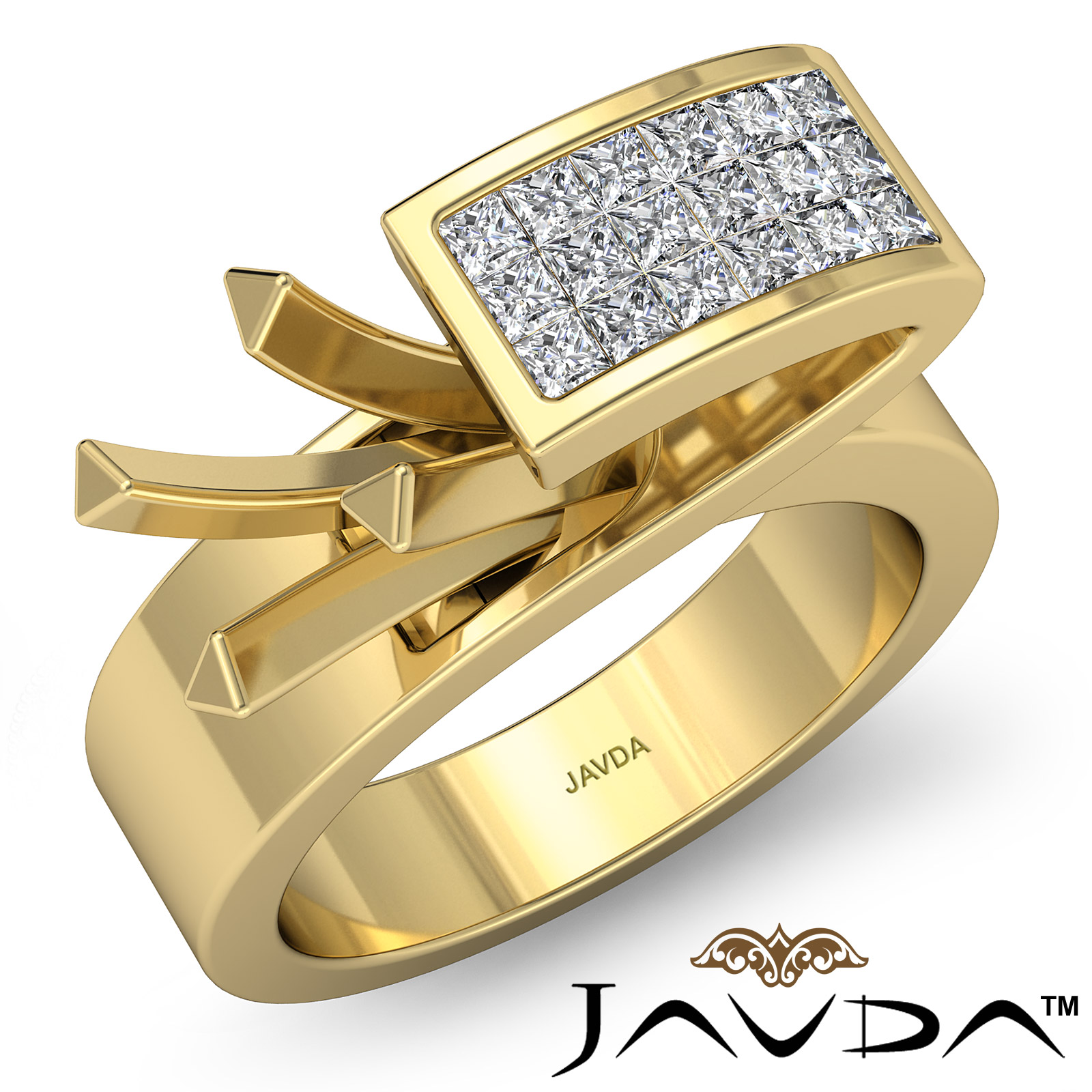 This sweeping design diamond engagement ring is made in 18k Gold Yellow. It features a princess cut semi mount, with princess diamonds beautifully set in invisible setting on this very unique shank. (0.65Ct. tw.)