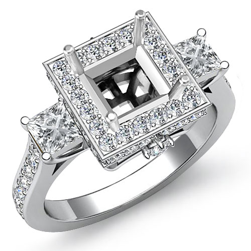 A beautiful blend of modern, yet traditional, this 18k Gold White ring features a semi mount princess center stone with diamond enhancers in halo, flanked by Princess side stones and