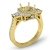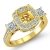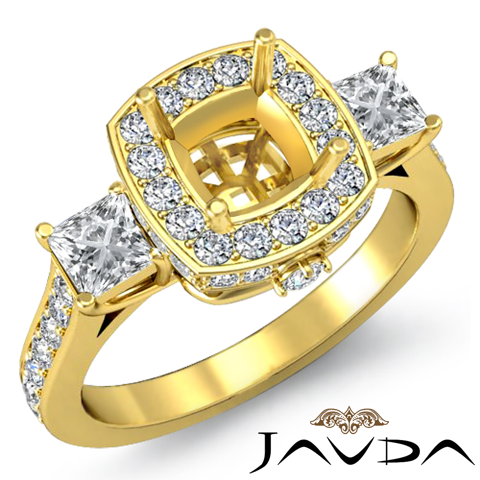 A unique blend of modern, yet traditional, this 14k Gold Yellow ring features a semi mount cushion center stone with diamond enhancers in halo, flanked by Princess side stones and