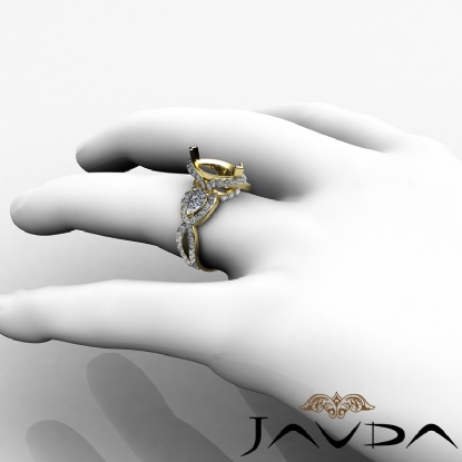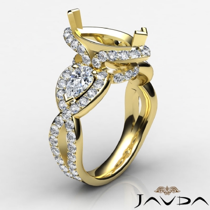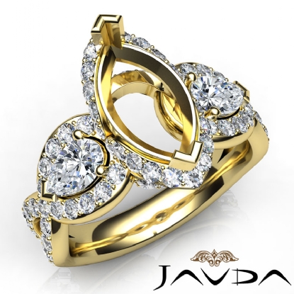This blooming beauty features three stone engagement ring made in 18k Gold Yellow. of round diamonds frame the semi mount marquise diamond halo & the shank, surrounding the